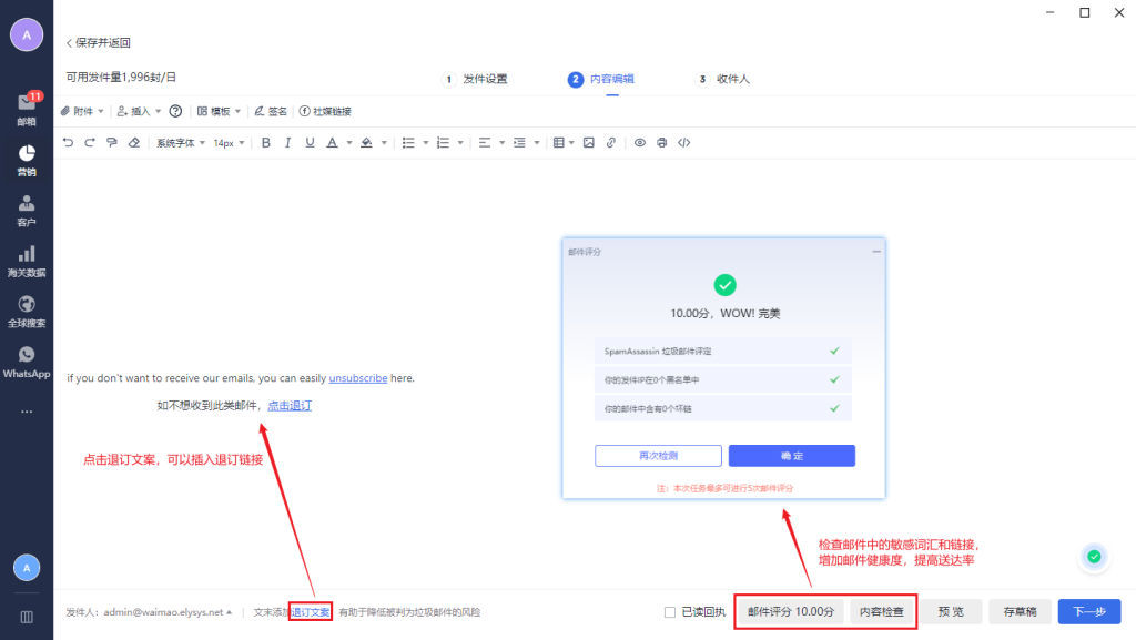2.1.邮件内容编辑完成之后还可以通过添加退订链接、邮件评分、内容检查等方式,帮助我们提高邮件的送达率