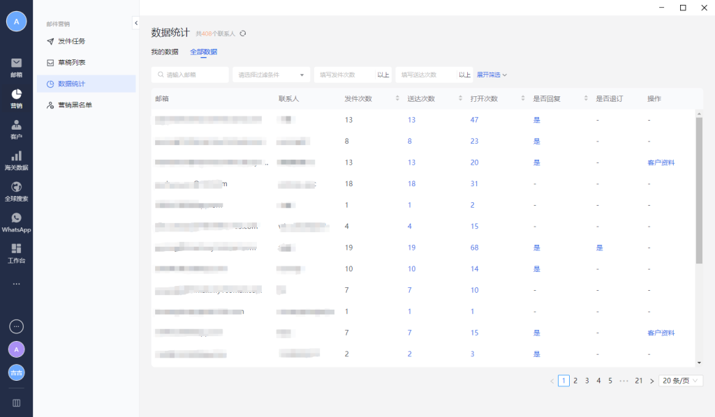 1.2点击营销按钮→数据统计→全部数据界面可以看到给具体某一个客户发送邮件的数据