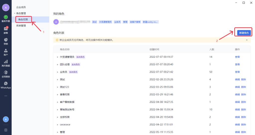 第一步:点击头像—权限设置、角色管理—新建角色