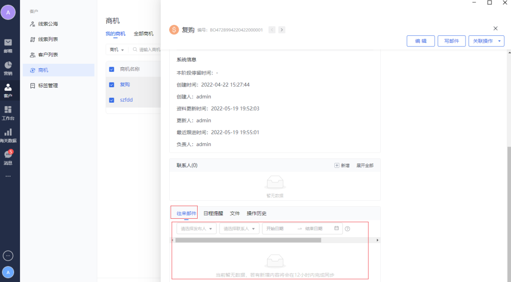 往来邮件的tab栏区域,显示商机联系人邮箱相关的往来邮件记录。