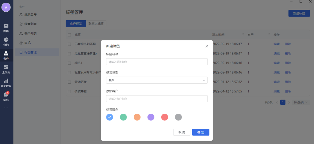 客户标签管理:可以新建不同标签,给客户打上不同的标签,便于区分不同的客户状态。
