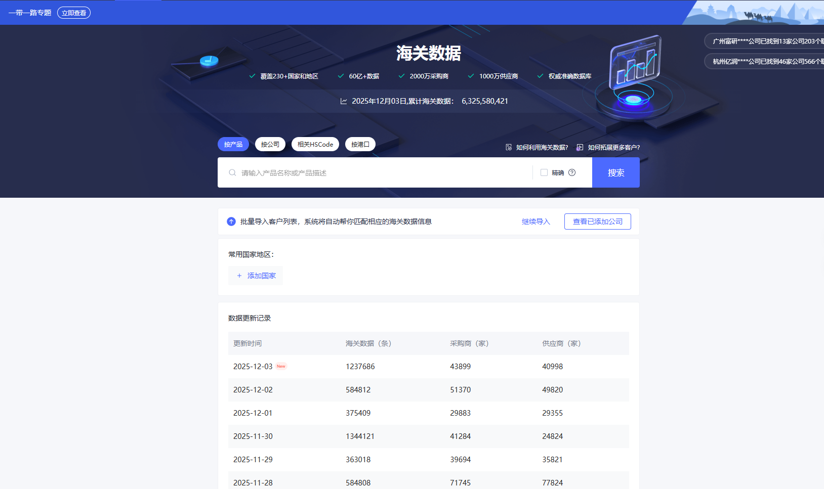 核心价值:提供全球商品进出口全景数据,支持多条件组合查询,助力全球贸易趋势分析与市场进入策略制定。